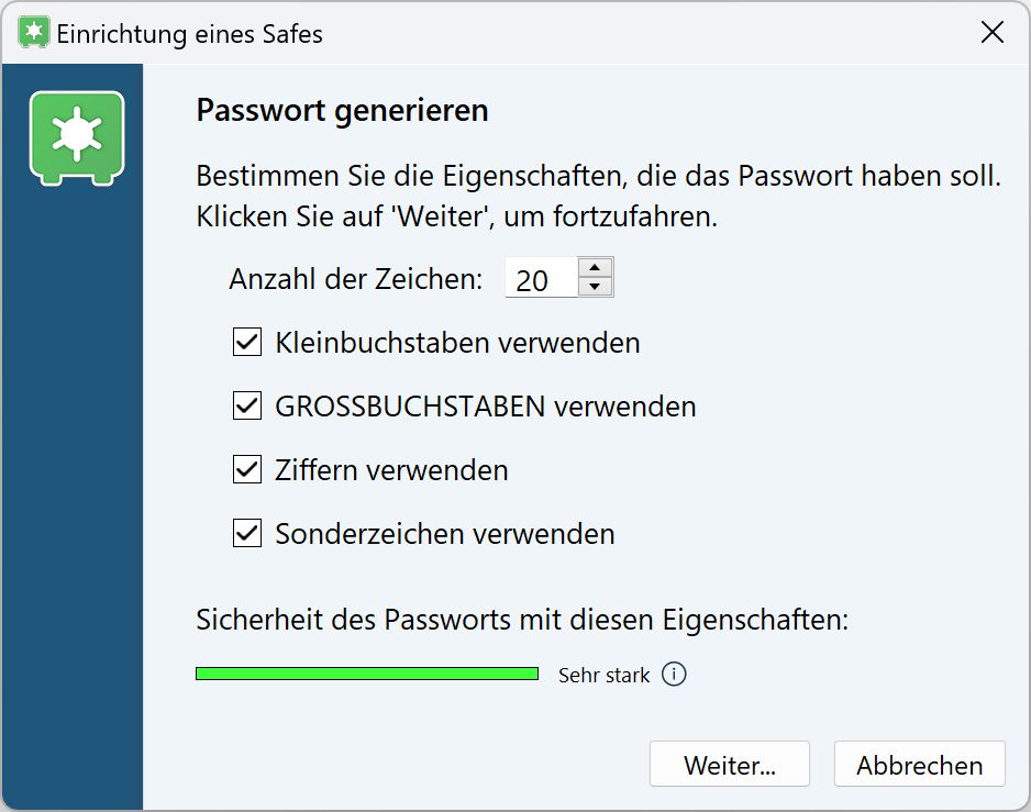 Sichern Sie Ihre Safes mit TOTP 2-Faktor-Authentifizierung, indem Sie beliebte Apps wie z.B. Authy, Microsoft Authenticator oder Google Authenticator als zweiten Faktor verwenden.Passwort-Qualitätsanzeige