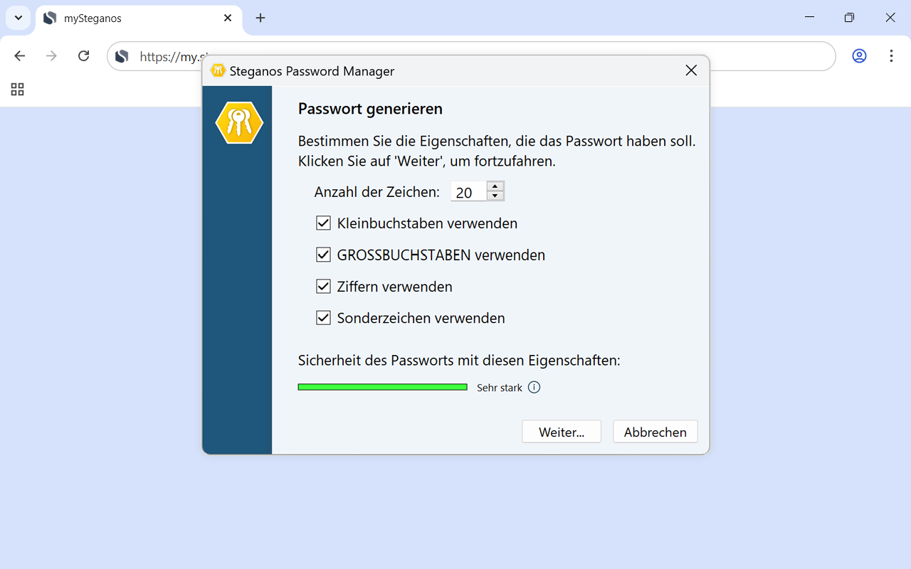 Bei der Registrierung auf einer neuen Website oder bei einem neuen Dienst schlägt der Steganos Account-Assistent sofort einen Benutzernamen sowie ein sicheres Passwort vor und hilft Ihnen, mit wenigen Klicks einen neuen Eintrag zu erstellen.Passwort-Qualitätsanzeige