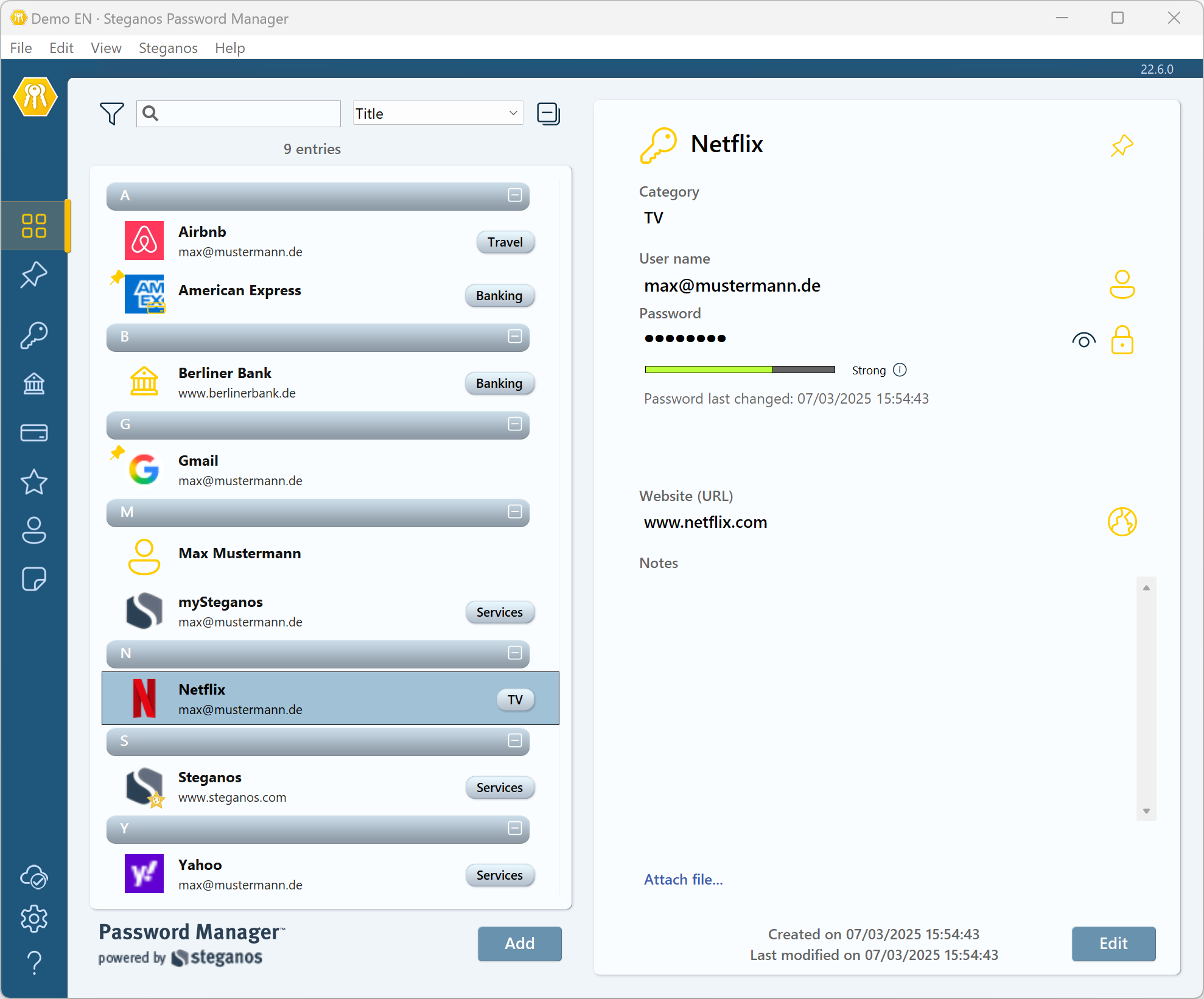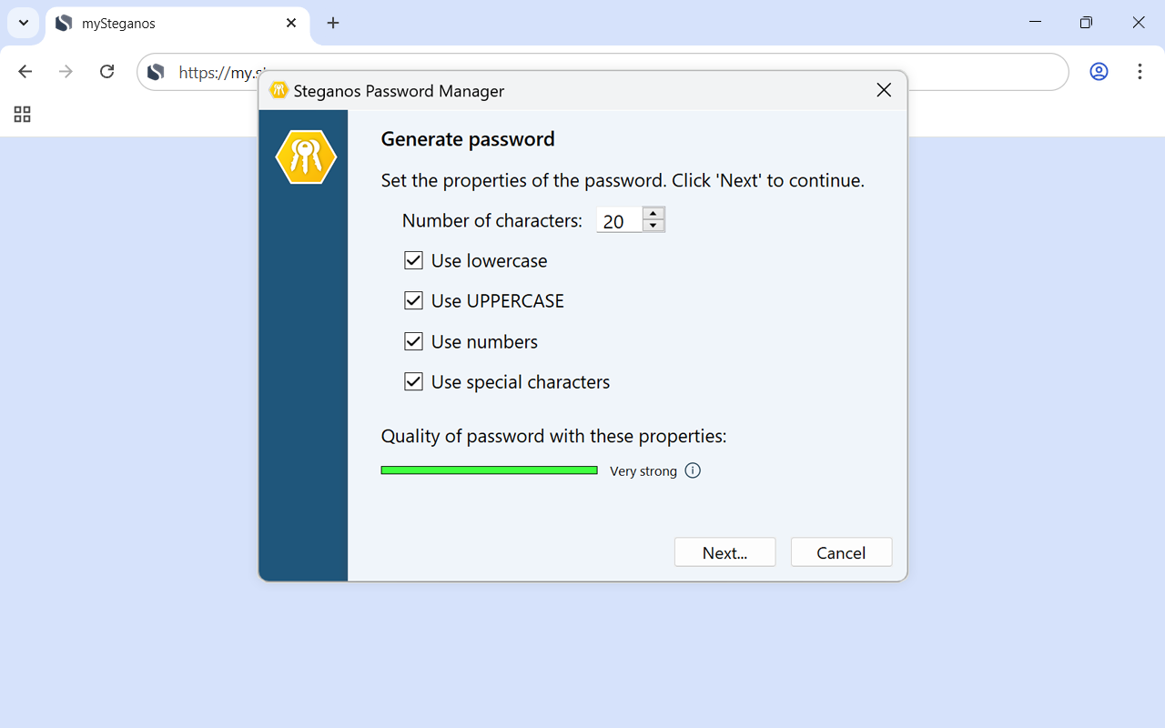 When registering on a new website or service, Steganos Account Assistant instantly suggests a username as well as a strong password - helping you create a new entry with just a few clicks.Password quality indicator